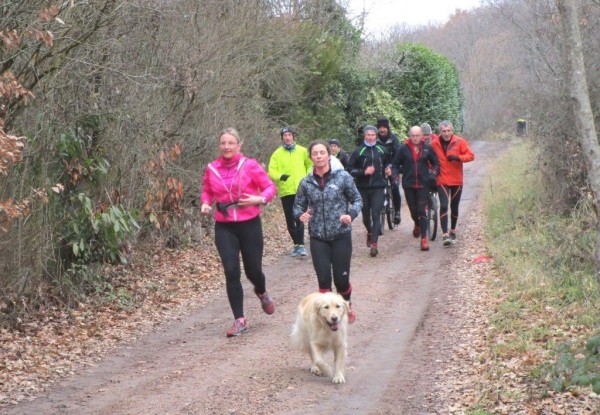 Quelques nouvelles de l'entraînement du jeudi matin, Hier 12 janvier (départ à 9h30 du stade de Mozac), nous étions 10 (dont 3 en vélo comme accompagnateurs ou en attente de reprise de la course à pieds) autour de Hanoi le labrador de Karine pour une sortie de 13 km en 1 h 25 sur la colline de Mirabel et les chemins de Marsat.